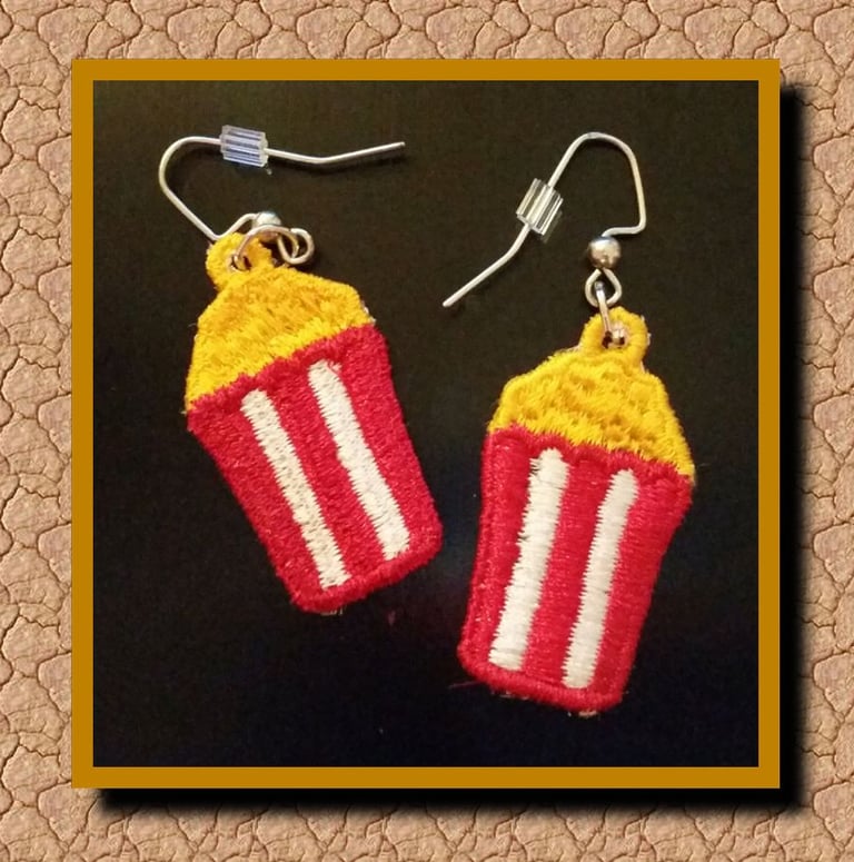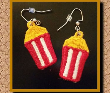 You do not have to stand there at the popcorn stand and eat it...take the popcorn with you wherever you go, with these delightful earrings which can also be used as bag charms or a zipper pull.